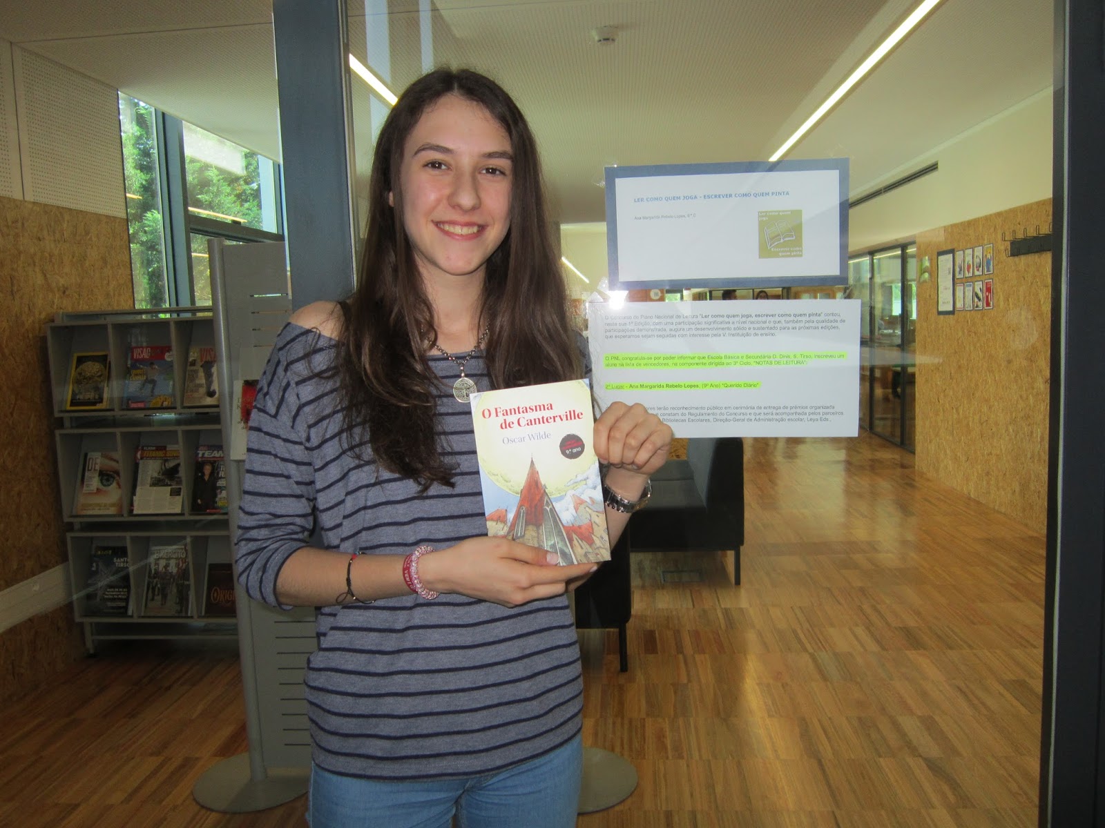 Ana Margarida Rebelo Lopes, aluna desta escola, com o seu “Querido diário”, conquistou o 2.º lugar na componente “Notas de Leitura”, dirigida ao 3.º ciclo, do concurso “Ler como quem joga – Escrever como quem pinta”, a nível nacional.